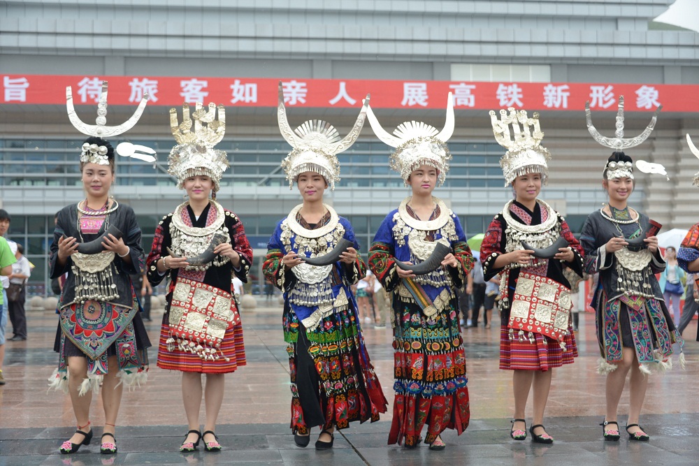 6月18日,凯里地区上千名群众穿戴一新,自发聚集到沪昆高铁凯里南站站前广场,载歌载舞欢庆“家门口”开通高铁列车。(蒋建民)