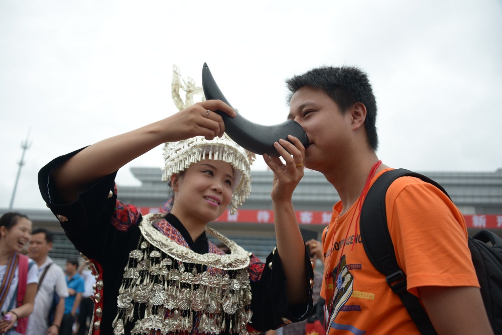 凯里群众向乘坐沪昆高铁第一趟列车出入凯里南站的旅客敬酒