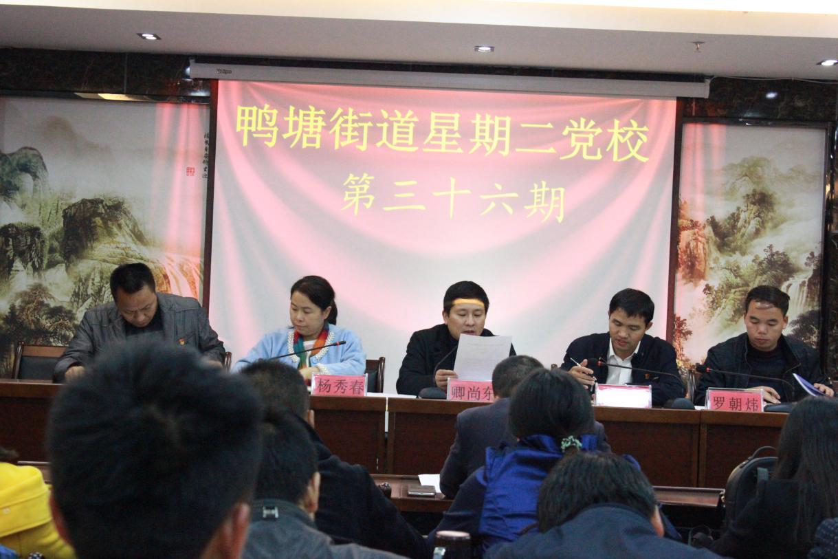 为不断培养鸭塘街道干部优良作风,推进鸭塘片区城市提升改造项目,确保街道各项工作顺利开展。鸭塘街道党委、办事处本着以人为本的原则,自2016年11月15日,将“星期二夜校”改为“星期二党校”,学习时间由原来的星期二晚上19:00改为星期二下午16:30。学习时间的调整得到广大干部的理解和积极配合,更加主动的参加学习,学习能力不断提升,工作能力不断增强。目前,鸭塘街道“星期二党校”已进行第二期,继“星期二夜校”的第三十六期。