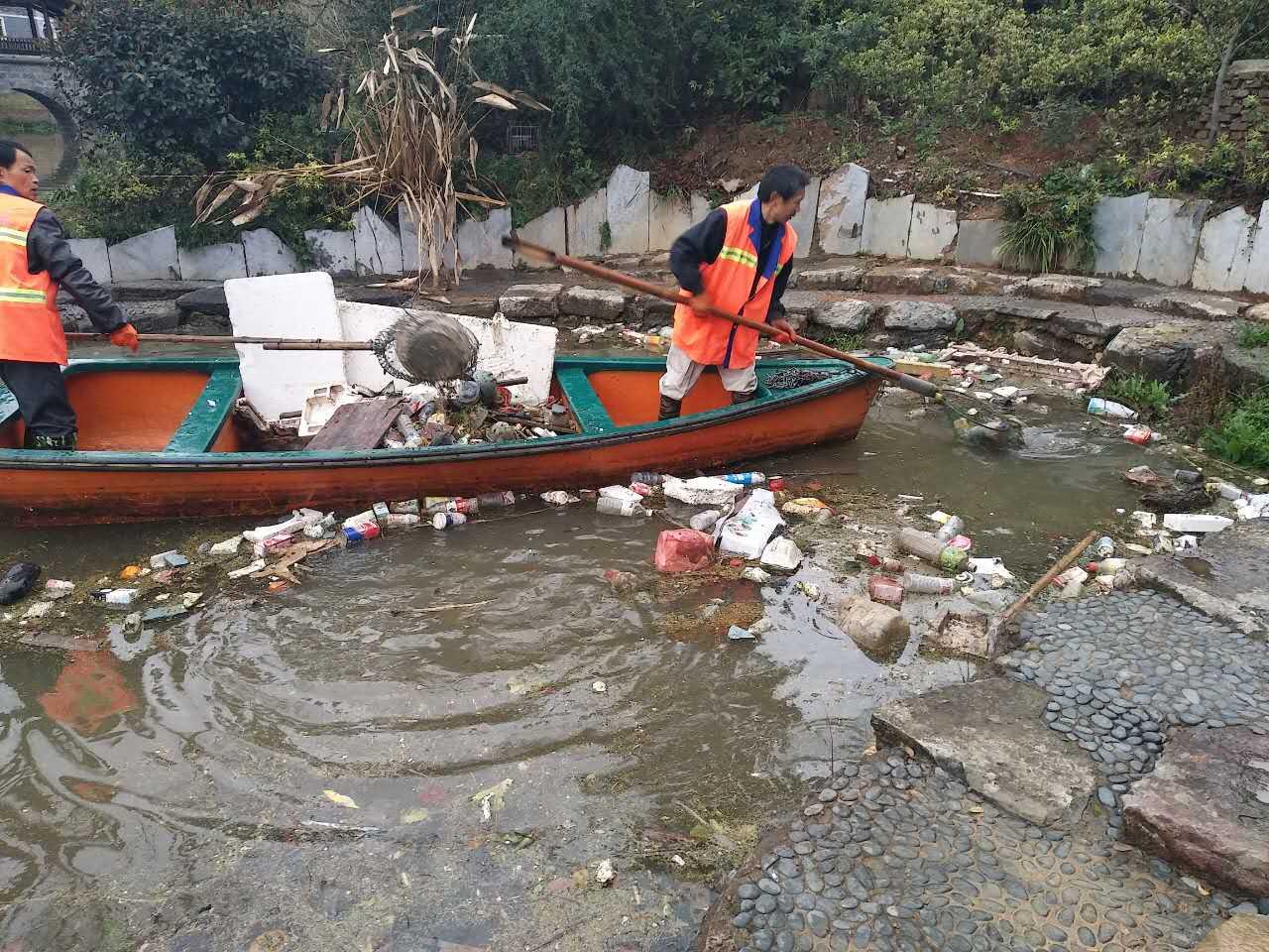 3、组织环卫工人20余名,出动洒水车2辆,对古镇内的卫生死角、河道垃圾、果皮箱进行清理,对春节期间街道上遗留的垃圾污渍进行了彻底的冲洗。