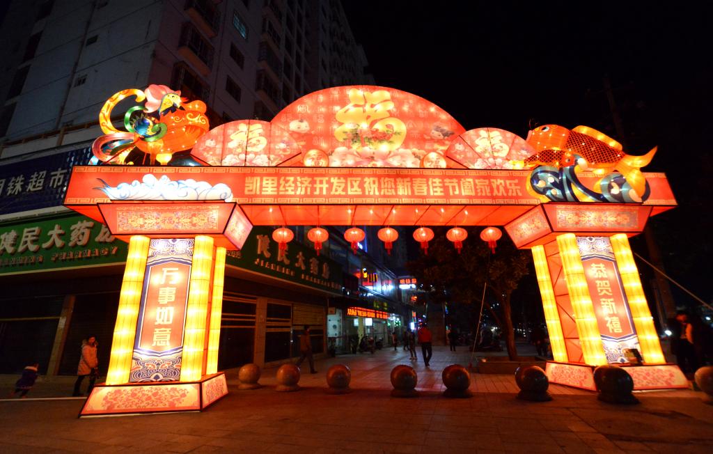 春节期间,凯里经济开发区在办公院落、交通要道、人流密集场所等重要节点,竖立起各种造型、五彩缤纷的迎春灯饰,亮点十足,营造喜庆、祥和的节日氛围。(凯里经济外宣办 蒋建民 摄)